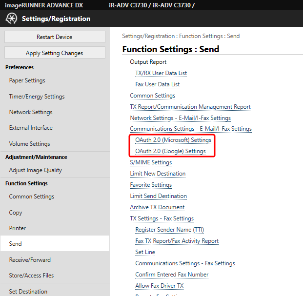 Prior to following the instructions in this guide, please ensure that that the OAuth 2.0 (Microsoft/Google) Settings buttons are available within the printer's Remote User Interface (RUI). If these are not visible as demonstrated below, please update the printer's firmware to the latest release.
