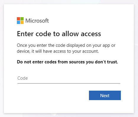 A new tab should open with a prompt for the code, enter your User Code from the previous section here.