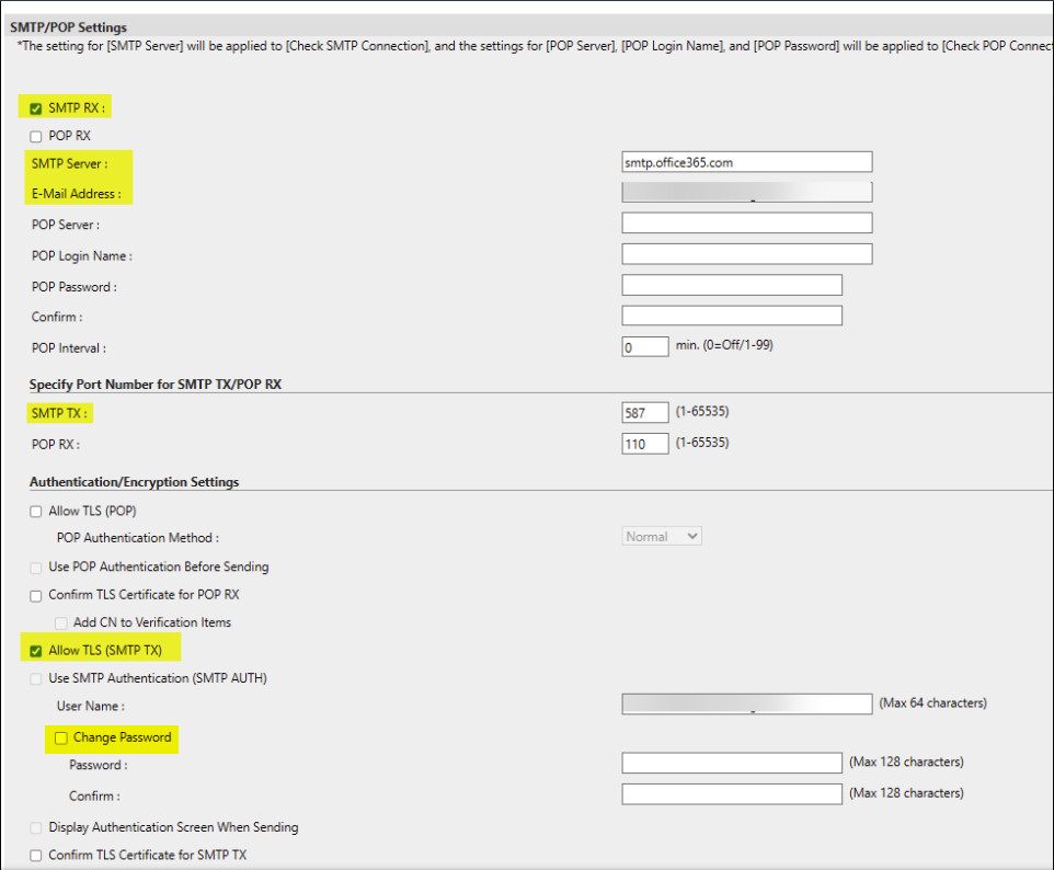 - Login to the printer RUI and navigate to: Settings / Registration > Function Settings > Send > Network Settings - E-Mail/I-Fax Settings.